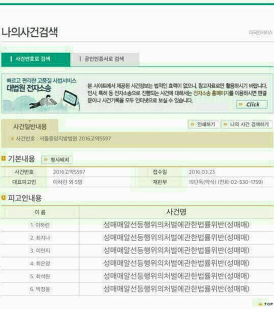 Trước đó, theo danh sách lộ ra trên trang trực tuyến của tòa án trung tâm Seoul, danh sách 6 người tham gia vào vụ mua bán dâm bao gồm 4 người nổi tiếng nữ: ca sĩ thần tượng nhóm Sugar - Lee Ha Rin, nữ ca sĩ G.NA (Choi Ji Na) , diễn viên Lee Min Ji và người đẹp Choi Eun Young;cùng với đó là 2 đối tượng nam được cho là người môi giới bán dâm gồm Choi Suk Won và Park Jung Yoon.