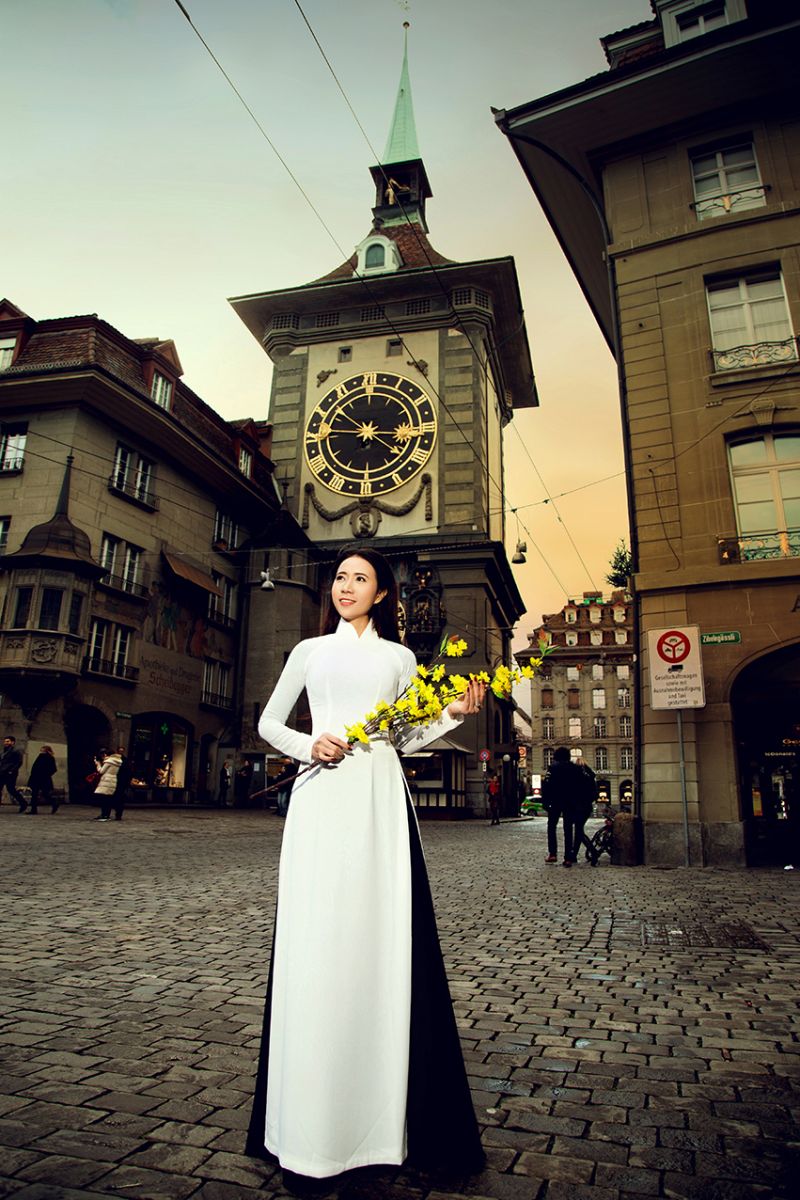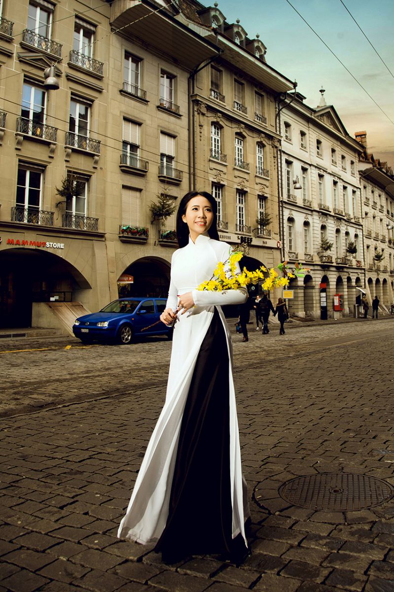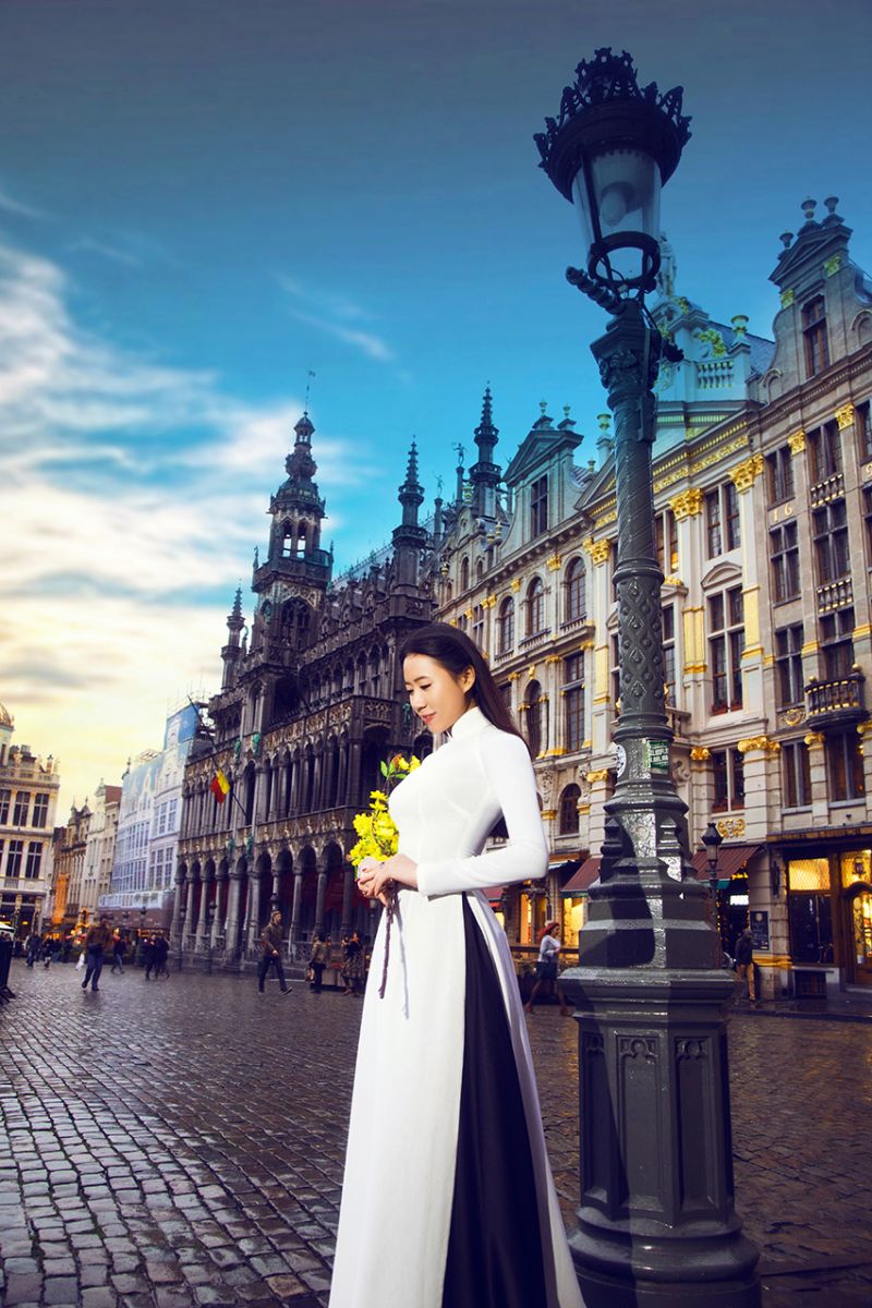 Á khôi gây chú ý trên những con phố cổ châu Âu khi thướt tha ngắm cảnh với áo dài trắng. Nhiều du khách cũng như dân bản xứ đứng lại trầm trồ chiếc vẻ đep giản dị nhưng quyến rũ của tà áo dài Việt Nam.