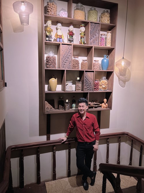 Ca sỹ Đoan Trường trầm trồ với kiểu kiến trúc Đông Dương độc đáo cùng với nội thất, vách tường, cửa ra vào, vách ngăn, bồn rửa tay được làm từ gỗ 5 con tàu biển có tuổi thọ hơn 50 năm.