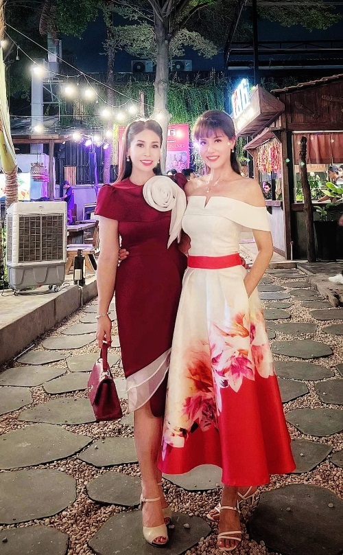 Không hẹn mà gặp, diễn viên Lý Hương cũng ‘diện’ trang phục màu đỏ như một lời chúc khai trương hồng phát đến cho Băng Châu và các cộng sự.