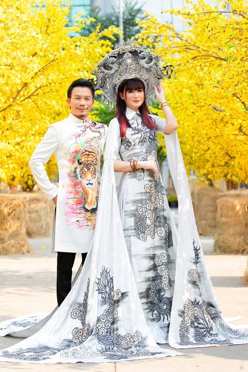 Lấy ý tưởng từ hoa văn cung đình được lồng ghép khắc họa nổi trên tà áo dài dành riêng cho diễn viên Hiền Mai. Mất 6 tháng chế tác với nhiều nghệ nhân làng nghề hợp tác, trên nền vải gấm dạ quang màu xám bạc, điêu khắc họa tiết hoa văn rồng nổi với 20 ngàn viên pha lê lớn làm nổi bật điểm nhấn của thân áo, áo dài được thiết kế với 1 tà lớn và 2 tà nhỏ. Chiếc áo này là một phiên bản trong bộ sưu tập Quốc Phục RỒNG ĐÔNG PHƯƠNG của NTK Minh Hùng.