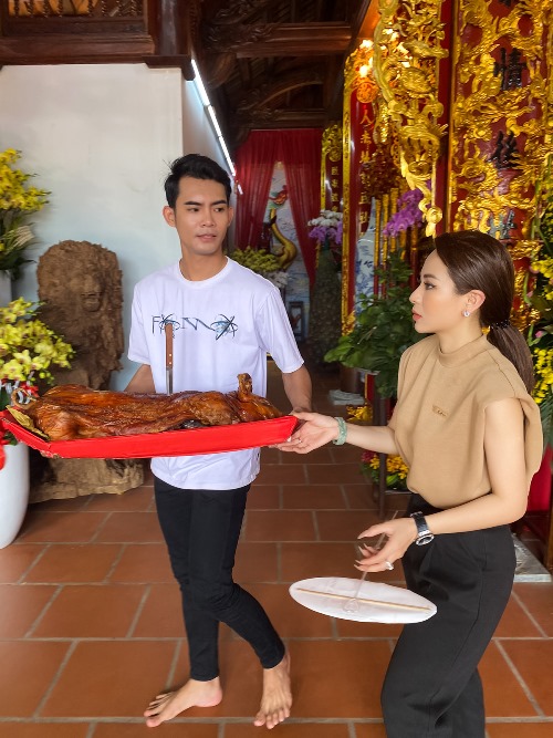 Cắm hoa, nấu ăn, dọn dẹp, lau chùi và chu toàn mọi thứ, giọng ca bolero Ánh Linh hạnh phúc khi được cùng ba nuôi Hoài Linh chu toàn trước sau cho ngày cúng tổ sân khấu trọn vẹn và ấm cúng.