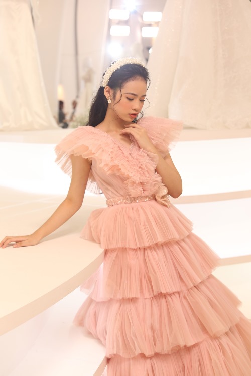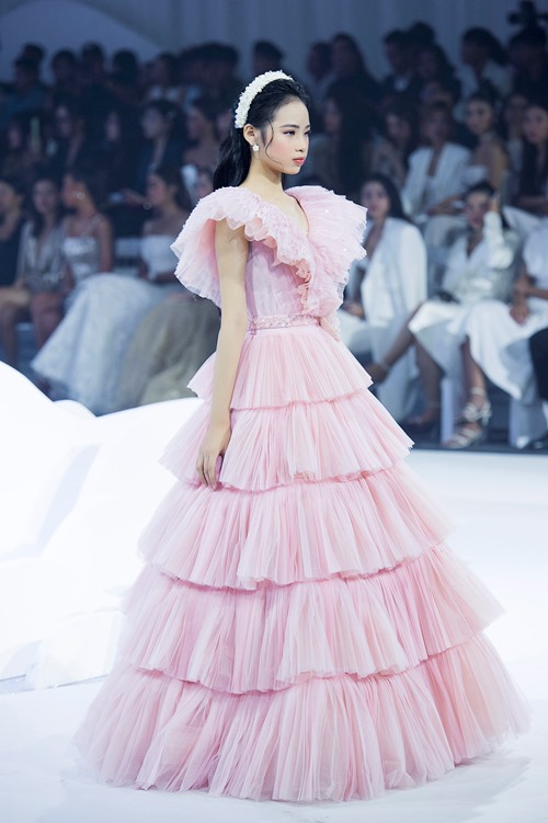Sải bước trên sàn diễn, Bảo Hà khiến giới mộ điệu về thời trang không rời mắt khi diện chiếc đầm màu hồng phấn với chất liệu bay bổng, nhẹ nhàng và nhiều tầng. Nếu như 10 mẫu nhí khác được NTK Chung Thanh Phong chọn những thiết kế có chung màu trắng – bạc thì Bảo Hà lại là gương mặt khác biệt khi dẫn đoàn “cô dâu” nhí toả sáng với chiếc đầm cô dâu màu hồng phấn cực xinh xắn.
