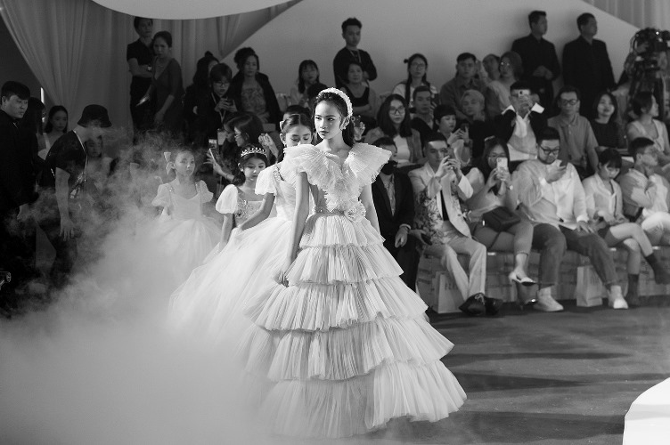 Sau hơn 3 tháng tạm hoãn vì dịch Covid-19, NTK Chung Thanh Phong trở lại hoành tráng khi viết nên câu chuyện cổ tính bằng BST cưới khiến giới mộ điệu thời trang mãn nhãn. Sải bước trên sàn runway cùng các đàn chị đình đám như Minh Tú, Hoàng Thuỳ… Mẫu nhí 11 tuổi Bảo Hà lại tiếp tục là gương mặt được chọn để “gửi vàng” khi hoá thân thành cô dâu dẫn đầu đoàn người mẫu nhí gồm 11 “cô dâu” bé nhỏ khi sải bước đầy tự tin trên sàn runway.