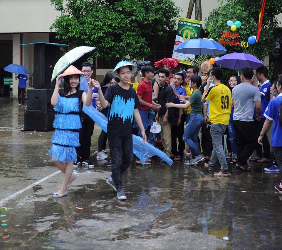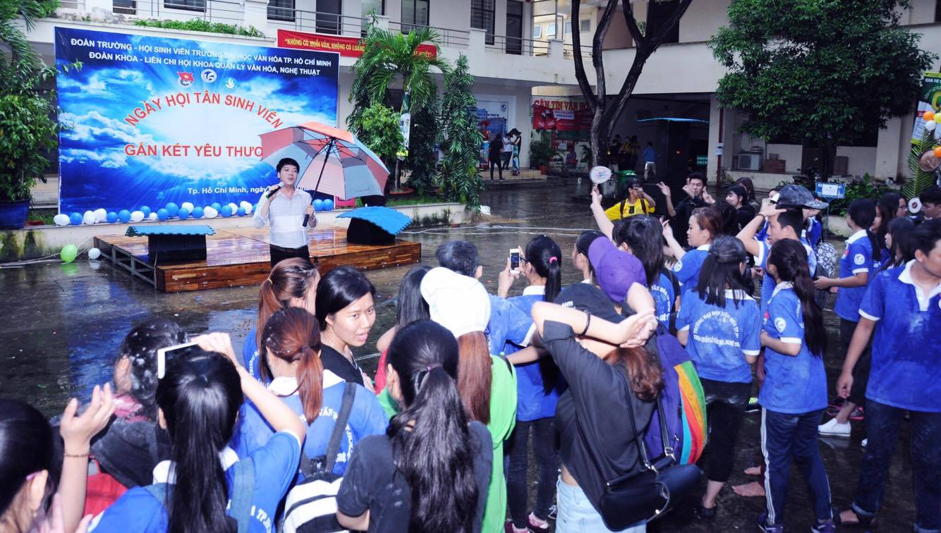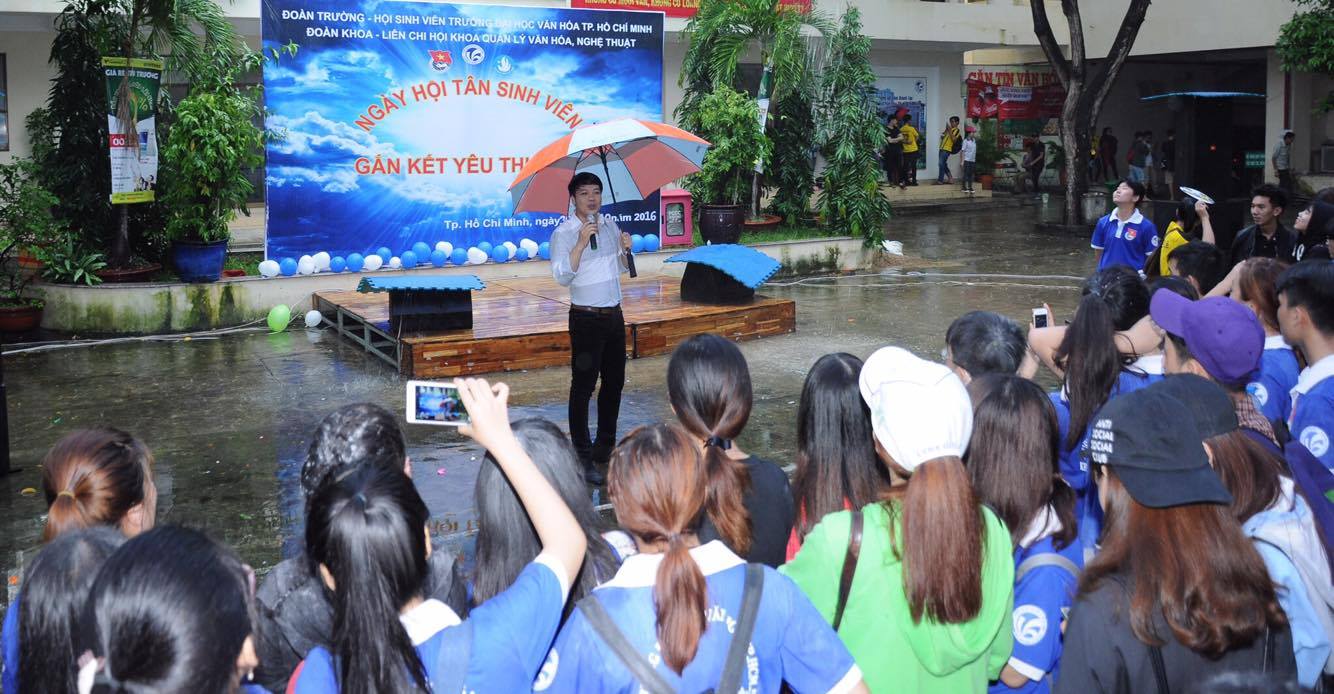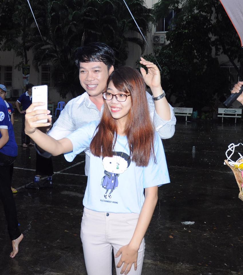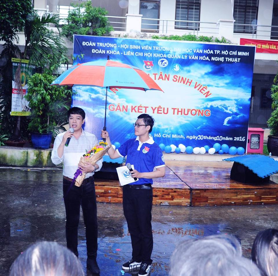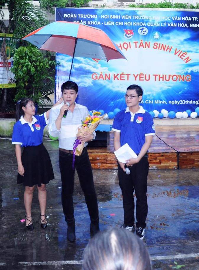 Bất chấp mưa to, Vỹ Khang đứng hát dưới sự hỗ trợ bằng chiếc dù của các bạn sinh viên Trường Đại Học Văn Hoá TPHCM.