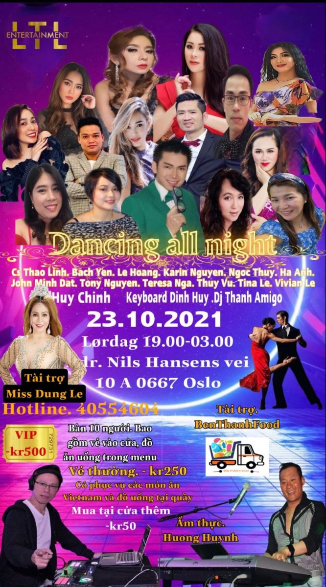 Đêm nhạc Dancing All Night với sự tái ngộ của các ca sĩ tại Na Uy đang được khán giả vô cùng yêu mến như: ca sĩ Bạch Yen, MC Nghệ Thuật Biển Xanh Huy Chính, ca sĩ Thảo Linh, Vivian Le, Thuy Vu, Thúy Hiếu – Bích Thuý, ca nhạc sĩ Lam Dinh Huy, DJ Thanh Amigo Clubs…