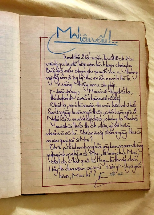 Hiền Mai vẫn còn giữ lại cuốn lưu bút cuối năm lớp 12 với những dòng chữ mà bạn thân Đoan Trường đã viết tặng và cô hạ bút phê 2 từ “được thôi” vào cuối trang giấy.