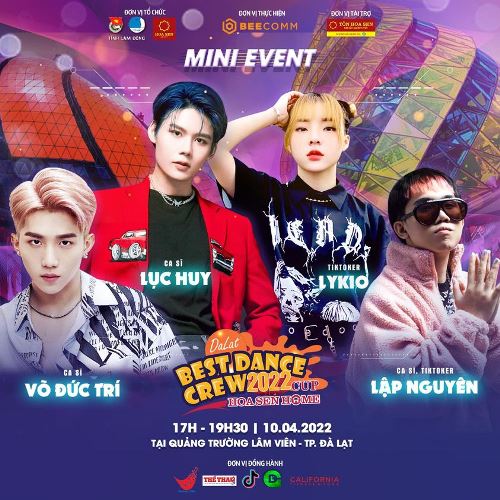 Theo thông tin từ Ban tổ chức, ngày 9 và 10/04 tới sẽ diễn ra mini event nằm trong chuỗi các sự kiện đồng hành cùng chương trình Dalat Best Dance Crew 2022 – Hoa Sen Home Cup được diễn ra tại Quảng trường Lâm Viên, Tp. Đà Lạt. Sự kiện sẽ có sự tham gia của biên đạo Buck, biên đạo Huỳnh Mến, rapper Mai Ngô, ca sĩ Lục Huy (Uni5), ca sĩ Rum, Hot TikToker Cindy, Võ Đức Trí, Lykio, Rybi Thanh Trúc và Lập Nguyên.