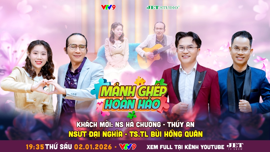 Mảnh Ghép Hoàn Hảo với câu chuyện của đôi vợ chồng NS Hà Chương – Thúy An sẽ phát sóng lúc 19:35, thứ Sáu ngày 02/01/2026 trên kênh VTV9. Chương trình do VTV9 phối hợp cùng Jet Studio thực hiện.