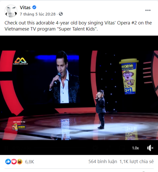 Cover hit của “hoàng tử cá heo” Vitas, “siêu nhí” 4 tuổi được chính chủ chia sẻ trên trang cá nhân