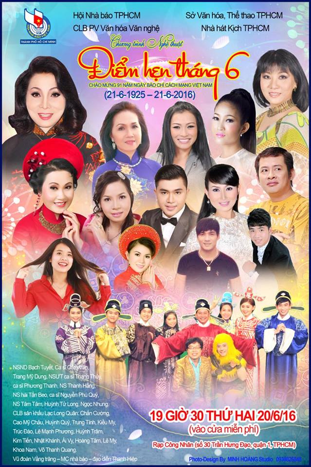 Chào mừng kỷ niệm 91 năm ngày Báo chí cách mạng VN (21-6-2016). CLB Phóng viên Văn hóa Văn nghệ Hội Nhà báo TPHCM tổ chức chương trình văn nghệ “Điểm hẹn tháng sáu” tại rạp Công Nhân (số 30 Trần Hưng Đạo, quận 1, TPHCM) vào lúc 19 giờ 30 ngày 20-6-2016