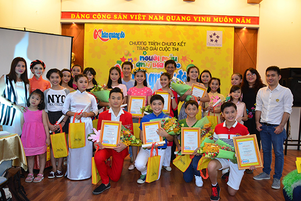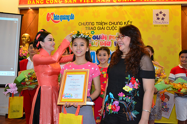 Bà Trần Thị Thùy Trang (Giám đốc TNHH SX Trang Trần – nhãn hàng Thời trang trẻ em Vani Nice) và bà Trần Gia Bảo (Phó tổng biên tập báo Khăn Quàng Đỏ) trao hoa và quà cho em Trần Dương Tú Phương (lớp 6 trường Lê Ngọc Hân, TP.Mỹ Tho, tỉnh Tiền Giang) đoạt giải nhất cuộc thi “Người mẫu ảnh bìa báo Khăn Quàng Đỏ 2015”.