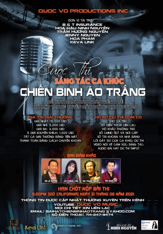 Cuộc thi được diễn ra ở quy mô toàn cầu, dành cho những người đam mê sáng tác nhạc và mong muốn tôn vinh công lao của đội ngũ y bác sĩ. Cơ cấu giải thưởng gồm 1 giải nhất trị giá: 10.000 USD, giải nhì trị giá: 5.000 UDS, giải 3 trị giá: 3.000 USD và 5 giải khuyến khích trị giá: 1.000 USD.Các sáng tác không giới hạn thể loại tân nhạc hay cổ nhạc và sẽ được thẩm định bởi hội đồng ban giám khảo chuyên môn uy tín, chuyên nghiệp.Vừa qua, ban tổ chức chương trình đã có buổi họp báo chính thức tại Mỹ công bố dàn giám khảo bao gồm những cái tên đình đám như:Nhạc sĩ Lê Quang - Anh là một trong những nhạc sĩ, nghệ sĩ Guitar bass nổi tiếng của ban nhạc Da Vàng. Nam nhạc sĩ cũng ghi danh với những tác phẩm âm nhạc đình đám như “Một ngày bình yên”, “Đi về nơi xa”, “Mùa hạ mãi xa”, “Mưa trên cuộc tình”…