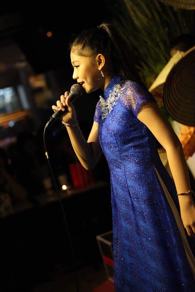 Ca sĩ Khánh Bình vừa hát vừa đi khắp khán phòng để quyên góp cho đêm nhạc.