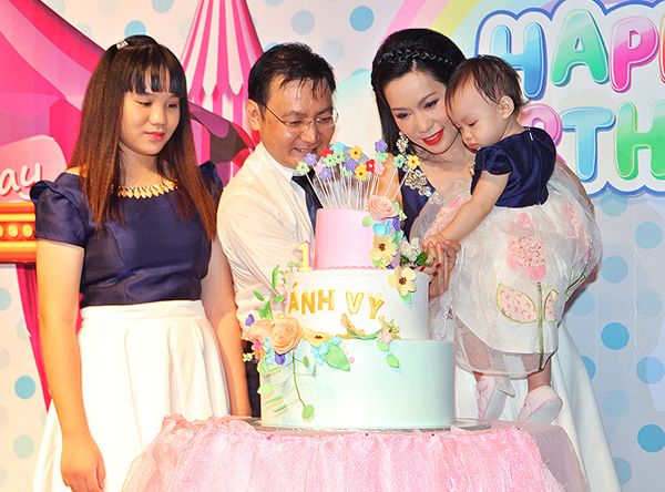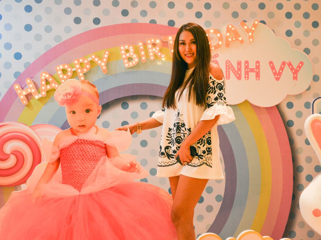 Nhân dịp mừng con gái thứ hai tròn một tuổi, vợ chồng Trịnh Kim Chi đã tổ chức buổi tiệc chiêu đãi người thân, gia đình, bạn bè và đồng nghiệp giới showbiz thật hoành tráng tại Trung tâm hội nghị While Palace vào tối qua (23/6).. Nhiều khách mời trầm trồ không ngớt không gian buổi tiệc đã được trang trí đầy đủ với màu hồng tươi tắn làm chủ đạo. Ngoài sảnh đón khách, Á hậu Việt Nam năm 1994 cho bày trí những tấm ảnh dễ thương của bé Ánh Vân