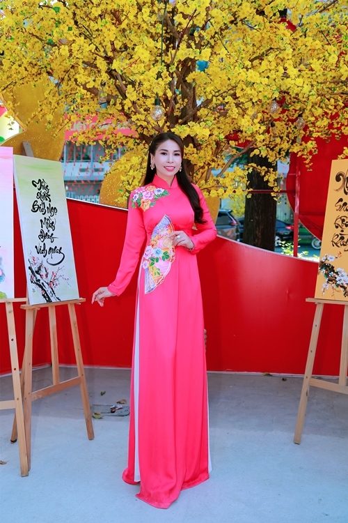 Diễn viên Cát Tường đằm thắm trong tà áo dài đỏ thắm tất bật chụp hình chung với du khách. Chị cho biết Tết này sẽ ra nước ngoài du xuân nên tranh thủ ghé qua phố ông đồ gặp gỡ các đồng nghiệp.