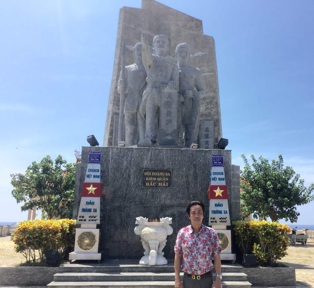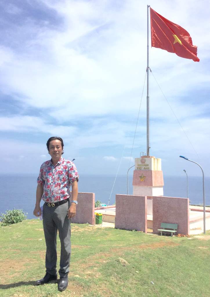 Đạo diễn Nguyễn Đức Long bên hai cột mốc Trường Sa và Hoàng Sa của mình tại huyện đảo Lý Sơn
