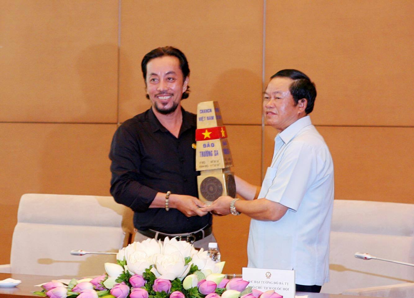 Đạo diễn Nguyễn Đức Long tặng mô hình cột mốc Trường Sa đúc bằng đồng khối cho Đại Tướng, Thứ trưởng Bộ Quốc Phòng, Phó Chủ Tịch Quốc Hội Đỗ Bá Tỵ