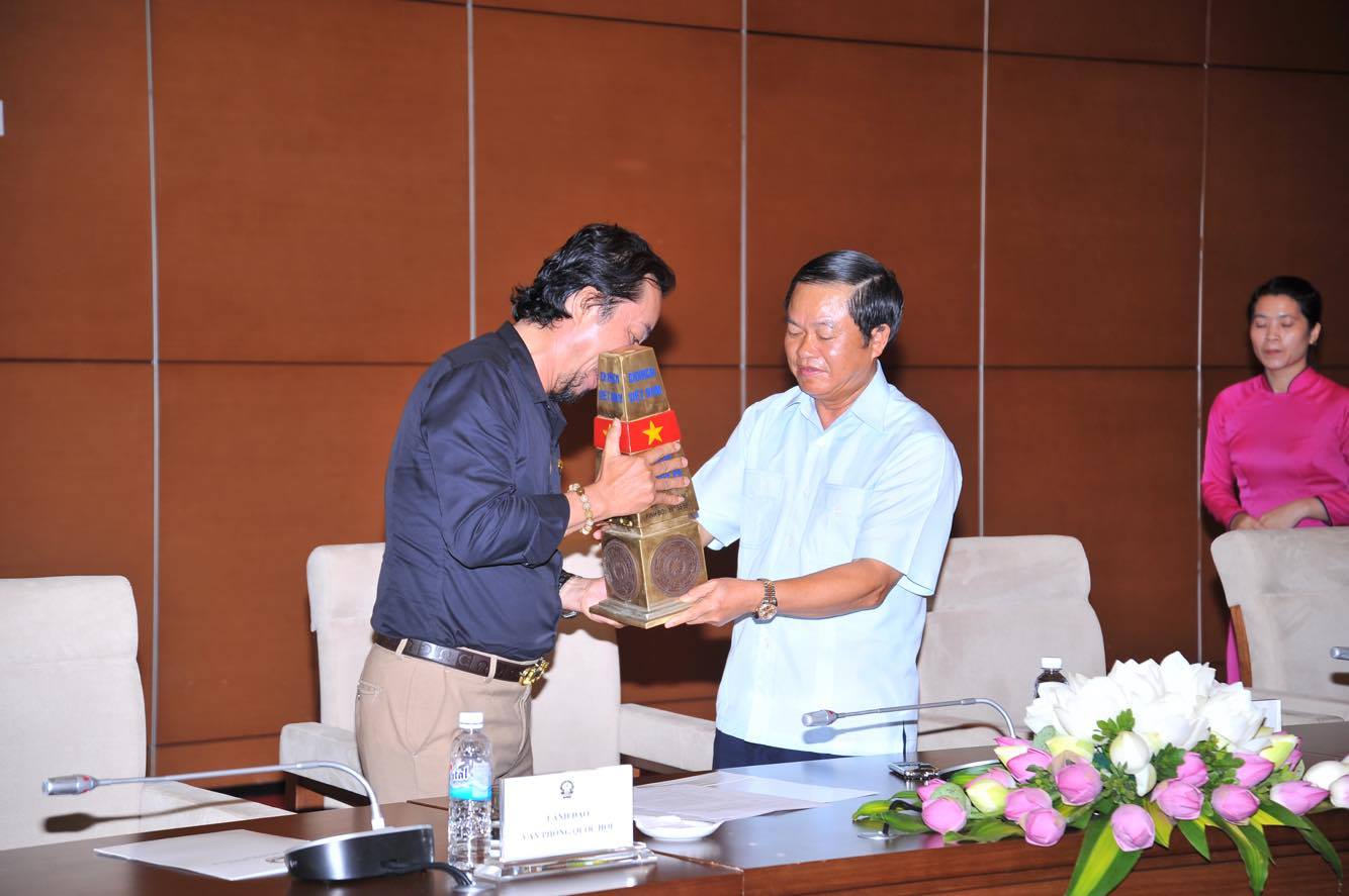 Đạo diễn Nguyễn Đức Long trao tặng mô hình cột mốc Trường Sa cho Phó Chủ Tịch Quốc Hội