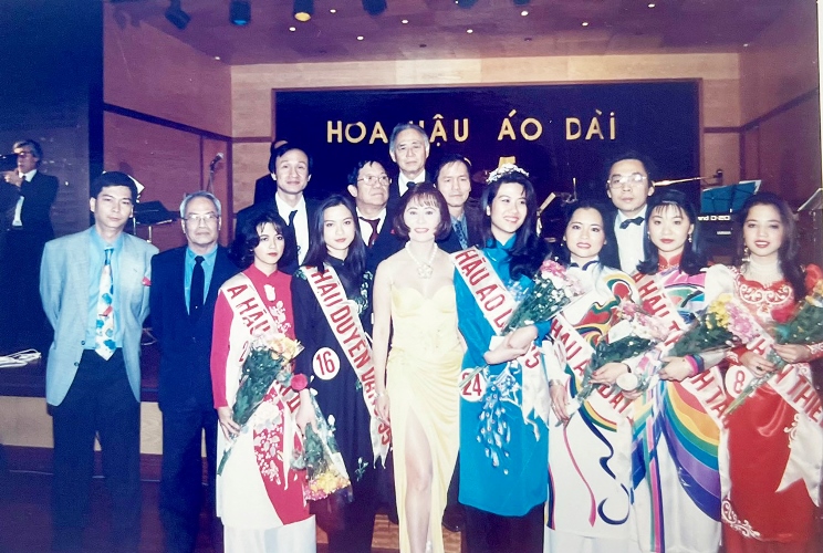 Cô Claire Nguyễn (áo dài xanh, hàng đầu tiên) thời đoạt danh hiệu Hoa hậu Áo dài Việt Nam tại Pháp cách đây gần 30 năm (vào năm 1995).