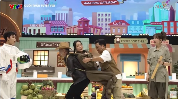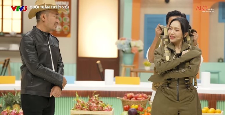 Trang phục của bà xã Anh Tú có khá nhiều túi cùng các chi tiết trang trí bằng dây dù đặc trưng mà những “người thợ áo cam” thường vận khi tác nghiệp, đồng thời, phần đai an toàn được đính trên thân áo còn làm cho Diệu Nhi như một chiếc “ba lô di động”. Ông xã Nhã Phương sau đó còn “xúi” Tiến Luật đeo thử “ba lô” và được “anh già” hưởng ứng nhiệt tình. Hậu quả, khi vừa “đeo ba lô” và kiệu Diệu Nhi trên lưng, một âm thanh xé rách đột ngột vang lên khiến nam diễn viên Đất rừng phương nam và khổ chủ “đứng hình” vài giây vì tưởng xảy ra sự cố rách trang phục.