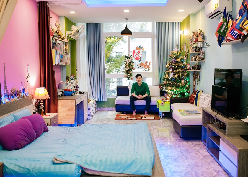 Trước cửa phòng, các vòng nguyệt quế, những chiếc xe nai và ông già Noel như chào đón mọi người đến tham quan không gian sống của anh.