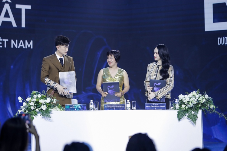 Bà Nguyễn Thị Thúy Nga ký kết và tặng hoa cho Hoa hậu Hương Giang và Dược sĩ Tiến