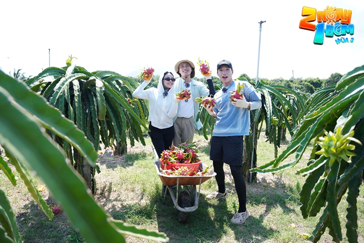 Xuất hiện tại vườn thanh long thuộc tỉnh Bình Thuận, dàn cast 2 Ngày 1 Đêm cùng 2 khách mời hoa hậu Khánh Vân và diễn viên Tam Triều Dâng đã hóa thân thành những người nông dân hái thanh long dưới thời tiết “gió như phang, nắng như rang”.