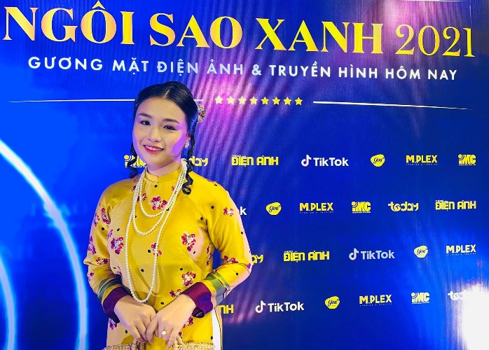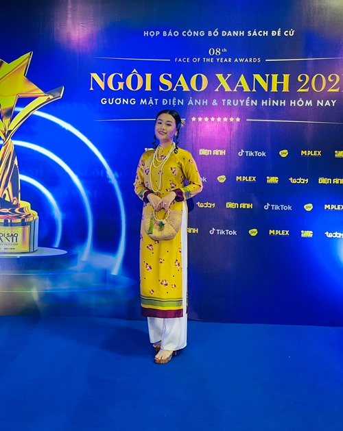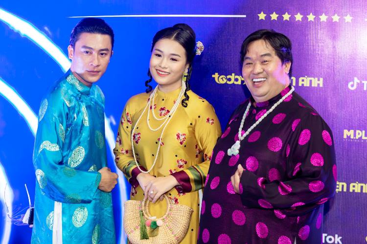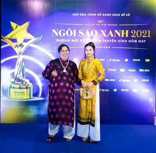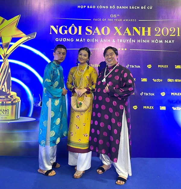 Gia đình Hoàng Thần Tài gồm đạo diễn Hoàng Mập, diễn viên Đông Dương, Diễn viên Khánh Trinh diện áo dài đồng điệu tại sự kiện ra mắt giải Ngôi sao xanh 2021
