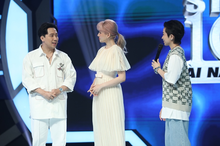 Vừa “chào sân”, Trấn Thành nắm tay vợ bước ra cùng bộ đồ ton-sur-ton khiến cho Gil Lê cũng phải ngỡ ngàng thốt lên lời khen. Ngay lập tức, Trấn Thành cũng chia sẻ: “Bình thường bước ra đường người ta cứ tưởng dắt chị đi chơi nên lần này phải diện đồ đôi như vậy”.