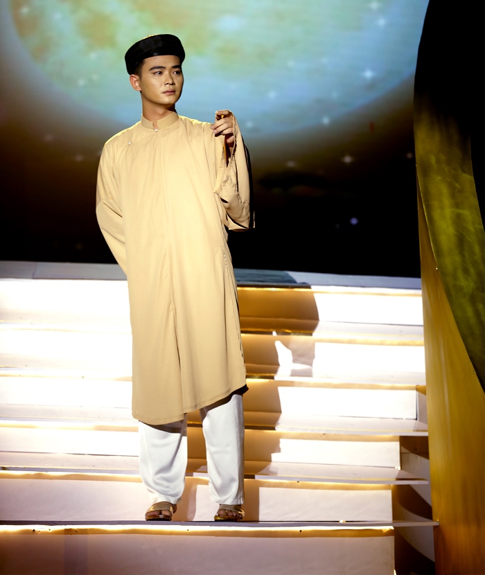 Thí sinh Hoàng Thắng chọn ca khúc Lan và Điệp 4 trong vòng thi Toả sáng với trang phục áo dài xưa truyền thống.