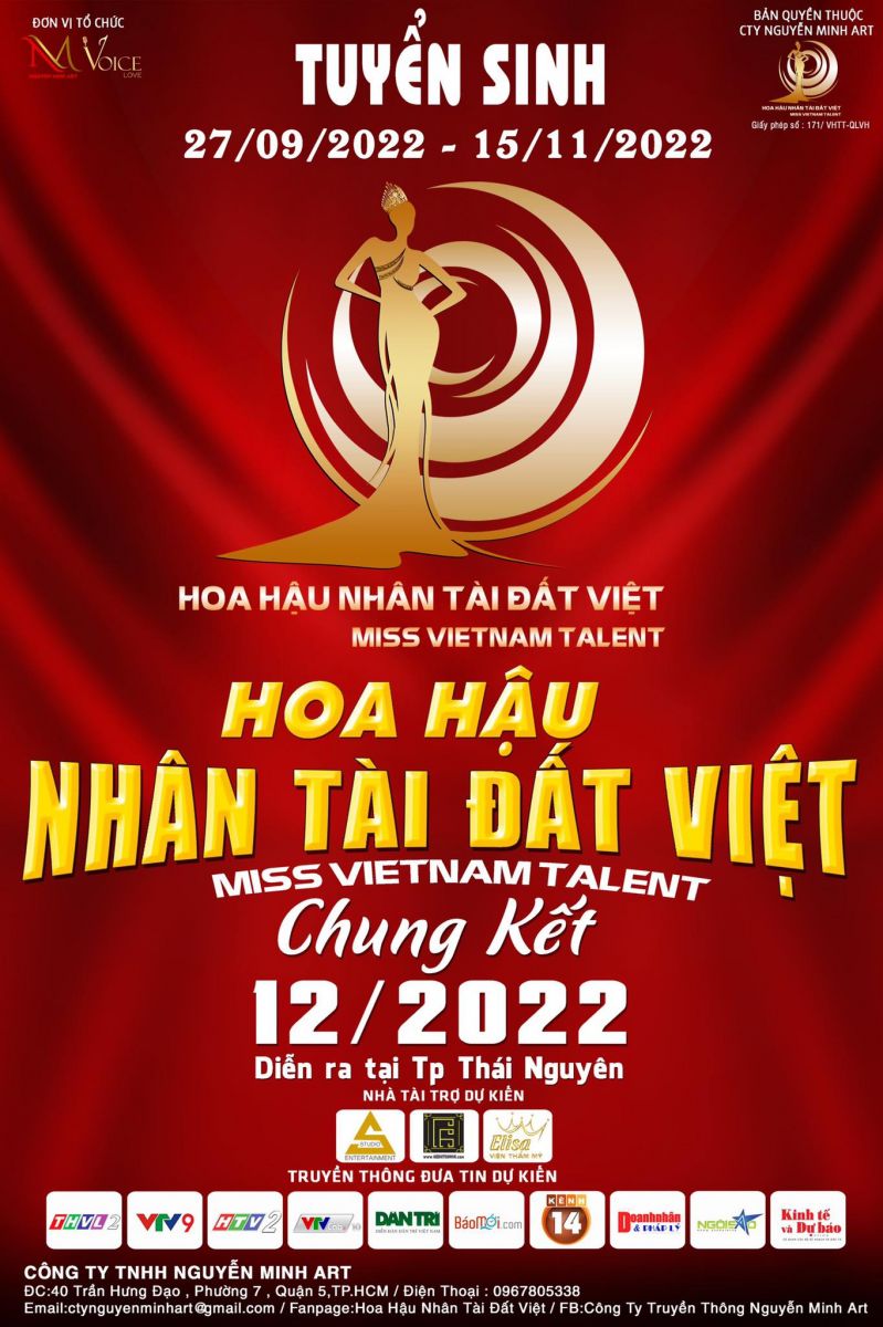 Tập đoàn truyền thông Nguyễn Minh ART và Công ty TNHH Giọng ca Vàng đã ký kết hợp tác về việc tổ chức cuộc thi Hoa hậu Nhân tài Đất Việt 2022 vòng chung kết sẽ được diễn ra tại thành phố Thái Nguyên. Dự kiến, cuộc thi Hoa hậu Nhân Tài Đất Việt sẽ diễn ra với nhiều vòng thi trong đó: Vòng casting qua ảnh, vòng sơ kết và bán kết sẽ được tổ chức tại Thành phố Hồ Chí Minh. Vòng chung kết sẽ được diễn ra 1 tuần từ ngày 20 - 26/12 tại Thái Nguyên.