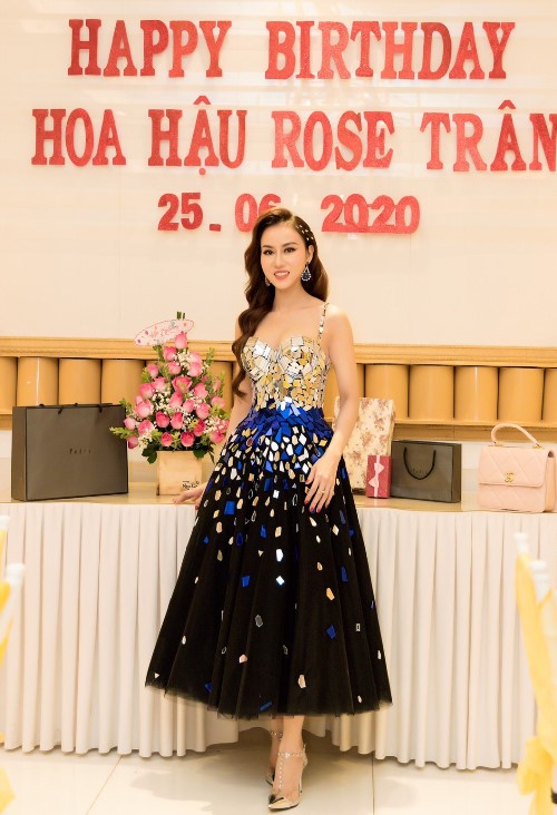 Trong tiệc sinh nhật mới đây, hoa hậu Rose Trân khoe nét đẹp trang trọng trong chiếc đầm ngắn được đính kết cầu kỳ của NTK Hoàng Tony.