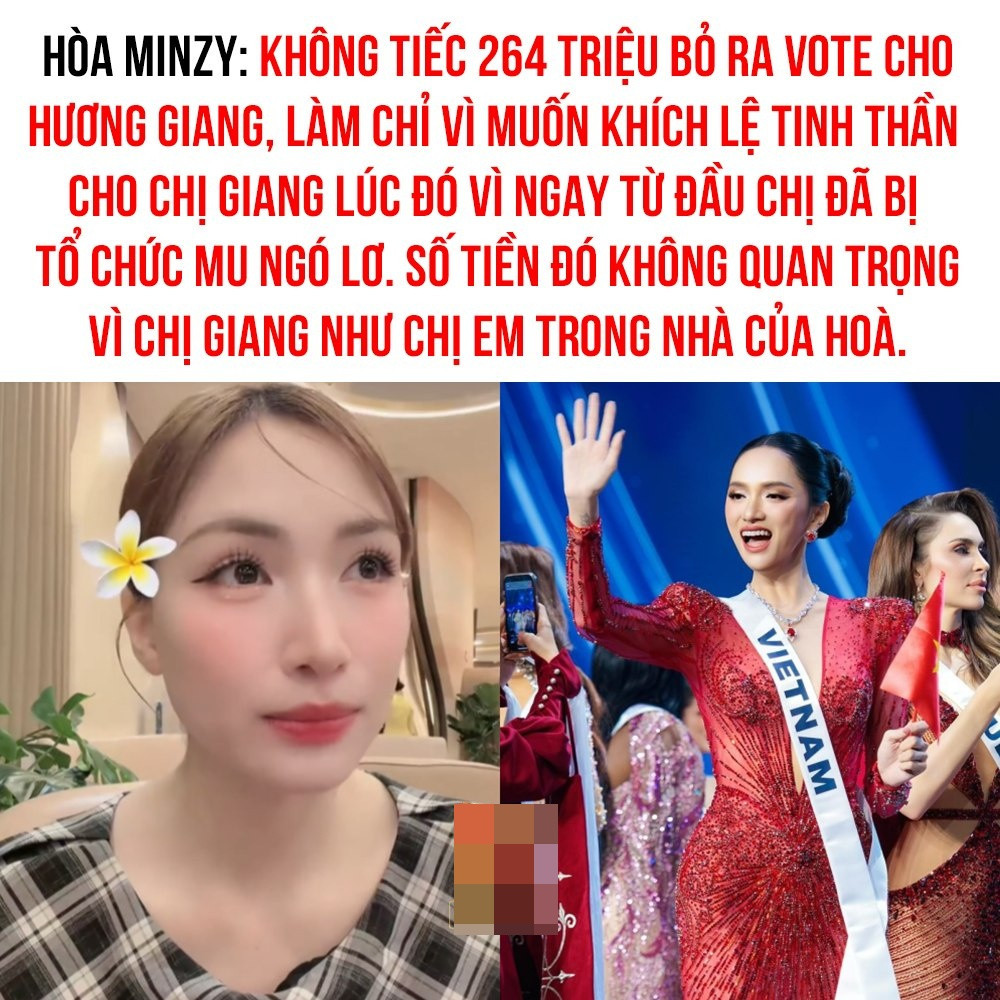 Hòa Minzy chia sẻ: "Tại sao chương trình đó lại láo toét như vậy. Hãy bù cho tôi 273 triệu đồng. Mọi người tiếc tiền cho Hòa nhưng Hòa không quan trọng, quan trọng là tình cảm Hòa dành cho chị Giang lúc đó. Hòa làm cái hành động đó để làm cú hick khích lệ tinh thần cho chị Giang vì chị Giang khá mệt và thiệt thòi vì ngay từ đầu gia nhập cuộc thi, ban tổ chức chậm chễ đăng hình của chị Giang. Số tiền đó không quan trọng vì chị Giang như người chị em trong nhà của Hòa nên Hòa ủng hộ chị thôi".