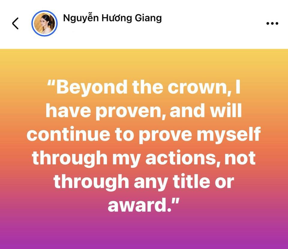 Hương Giang lên tiếng sau khi "trắng tay" ở Miss Universe: “Vượt lên trên chiếc vương miện, tôi đã chứng minh và sẽ tiếp tục chứng minh bản thân mình bằng hành động, chứ không phải bằng bất kỳ danh hiệu hay giải thưởng nào.”
