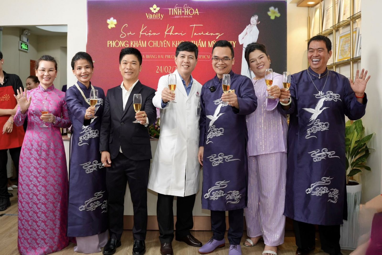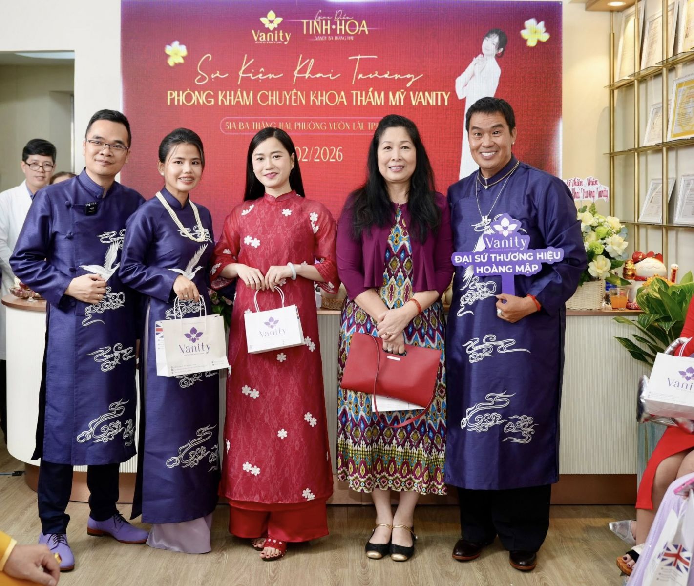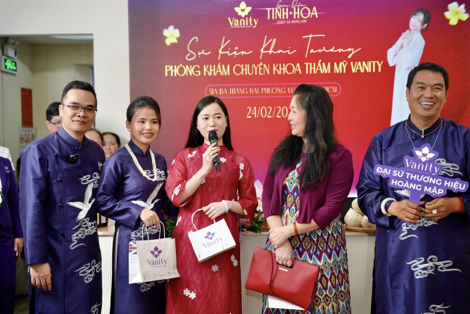 Nghệ sĩ hài Hoàng Mập diện áo dài tím, tham dự sự kiện đầu năm mà anh đảm nhận vai trò Đại sứ thương hiệu của Phòng khám Chuyên khoa Thẩm mỹ Vanity