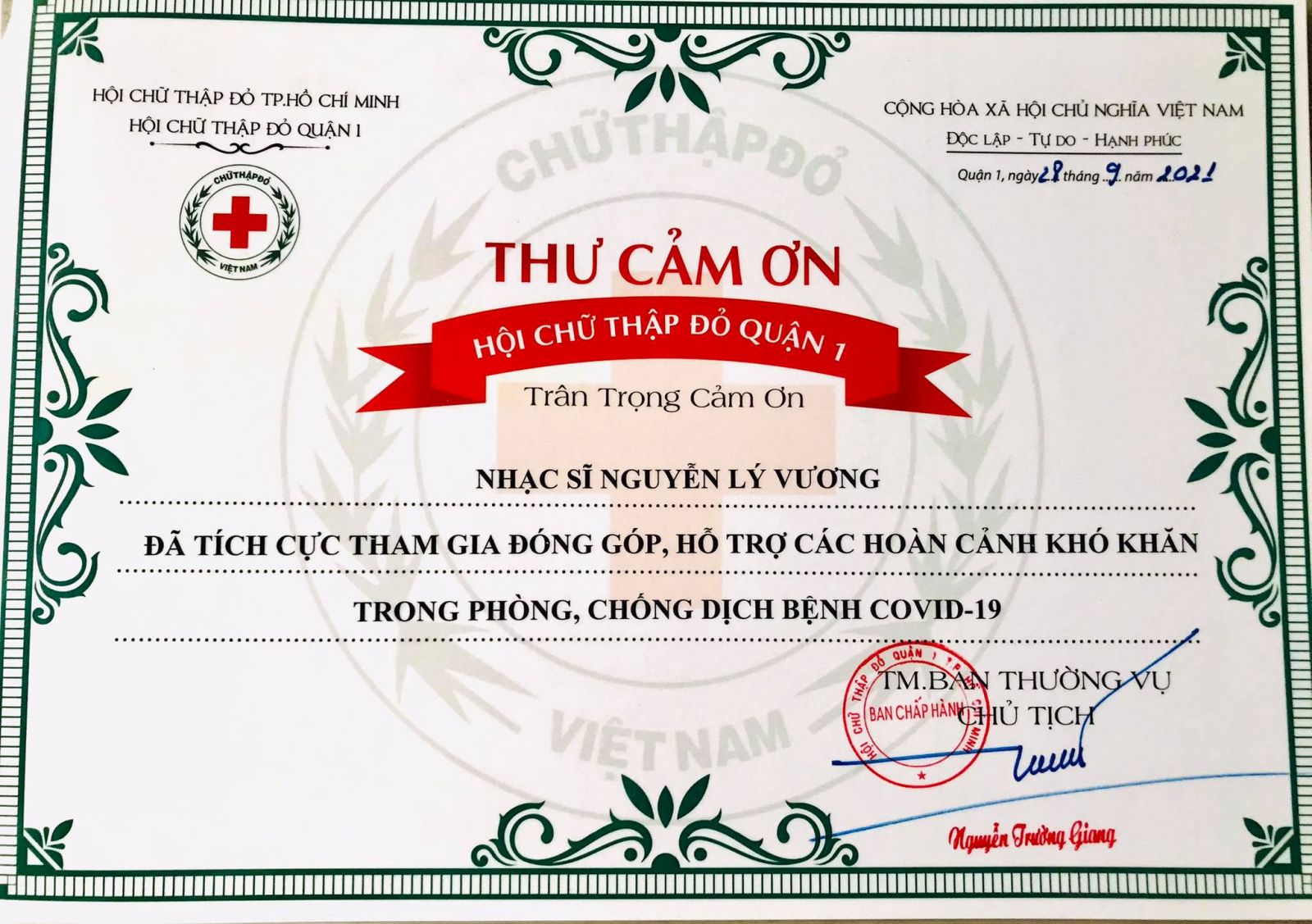 Thư cảm ơn của Hội Chữ thập đỏ quận 1, TP. HCM ghi nhận những đóng góp, hỗ trợ của Lý Nguyễn Vương cho các hoàn cảnh khó khăn trên địa bàn thành phố. Hơn 6 tháng qua, tác giả ca khúc Cành khô hoa vẫn nở miệt mài cùng với Hội Chữ thập đỏ quận 1 hỗ trợ lương thực thực phẩm, thuốc men cho những người nghèo, lang thang cơ nhỡ.