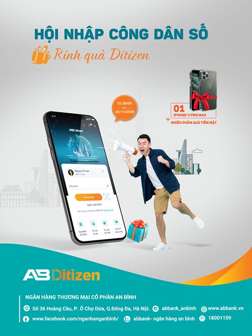 Nhân dịp ra cải tiến ứng dụng online AB Ditizen, Ngân hàng TMCP An Bình (ABBANK) áp dụng chương trình khuyến mãi hấp dẫn“Hội nhập công dân số - Rinh quà Ditizen” dành cho các khách hàng đăng ký mới, với cơ hội trúng iPhone 11 Pro Max 64Gb cùng nhiều phần quà giá trị.