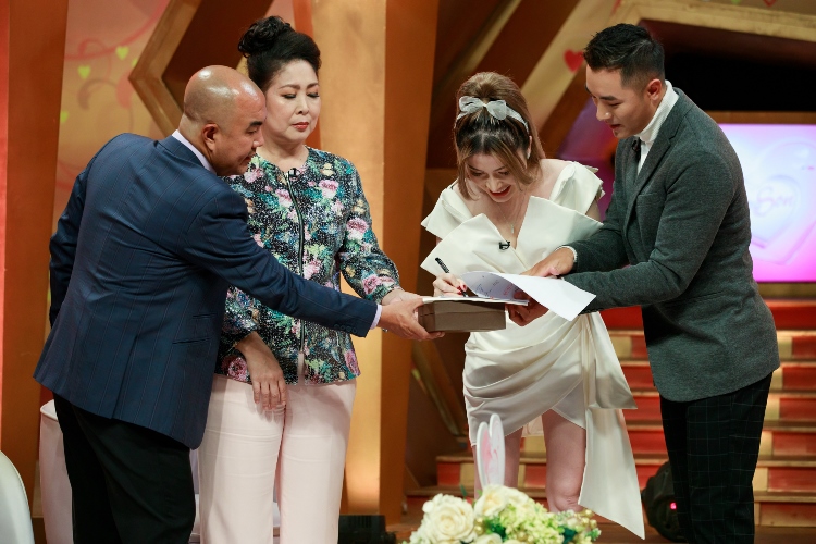 Bỏ cả sự nghiệp nghệ thuật để được đoàn tụ với vợ xinh đẹp, chàng “phi công” mít ướt bất ngờ mang hợp đồng khủng tặng vợ trên sóng truyền hình khiến Hồng Vân - Quốc Thuận xuýt xoa.