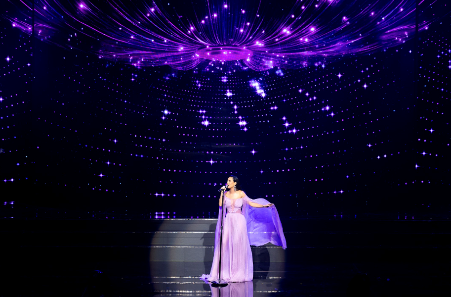 Mẫu đầm bay bổng của NTK Công Trí đã khắc họa nên một Katy Perry đầy thanh tao và lãng mạn giữa không gian hư ảo của sân khấu VinFuture.