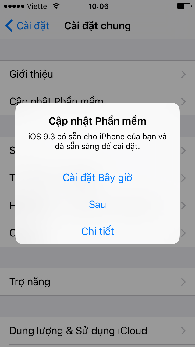 Bước 1: Trước hết, khách hàng cần thực hiện nâng cấp lên hệ điều hành IOS 9.3Vào Cài đặt (Settings) -> Cài đặt chung (General) -> Cài đặt phần mềm (Software Update)
