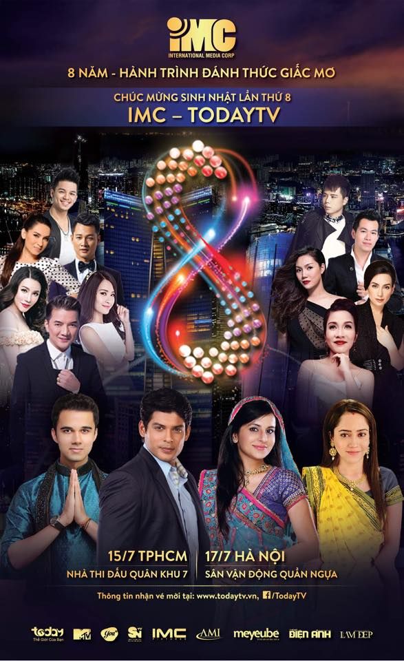 Đêm concert sẽ diễn vào lúc 18h00 ngày 15/7/2016 tại Nhà thi đấu Quân Khu 7 (Tp.HCM) và ngày 17/7/2016 tại Cung thể thao Quần Ngựa (Hà Nội). Đây không chỉ là sự kiện đánh dấu chặng đường phát triển của IMC- TodayTV mà còn là đêm diễn đặc biệt dành cho các fan của bộ phim “Cô dâu 8 tuổi”. Đừng bỏ qua 1 trong 3 cách sau: Tham gia contest “Săn Pop up – Nhận vé dự sinh nhật 8 năm IMC-TodayTV” diễn ra từ 19h00 - 21h00 mỗi ngày trên TodayTV; Gửi đăng ký trực tiếp và tham gia contest “Gõ cửa bất ngờ” trên Fanpage: www.facebook.com/TodayTV hoặc Tham gia trò chơi tương tác và nhận vé trực tiếp tại các Booth của TodayTV đặt tại hệ thống siêu thị tại Tp.HCM và Hà Nội, để có thể sở hữu tấm vé gặp gỡ dàn diễn viên đến từ Ấn Độ và những ngôi sao hàng đầu làng giải trí Việt