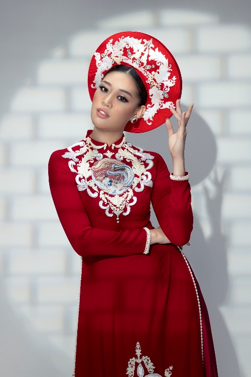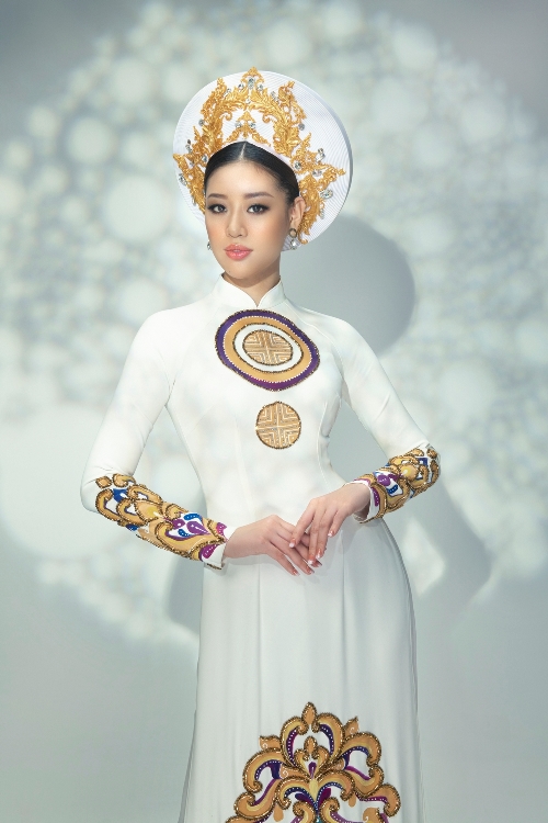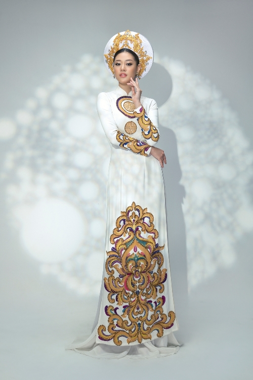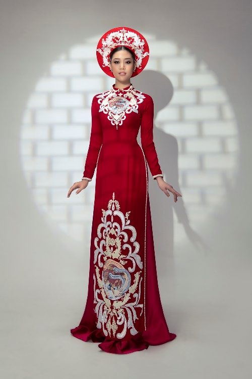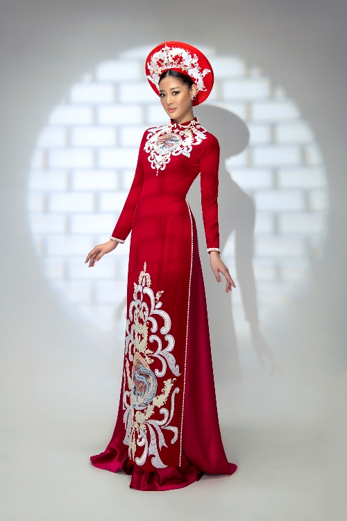 Trong loạt thiết kế mới, Minh Châu mang đến những mẫu áo dài là sự đan xen giữa yếu tố truyền thống và hiện đại, góp phần tôn lên vẻ đẹp nữ tính, trẻ trung của phái đẹp trong ngày trọng đại. Với hai màu sắc nổi bật là trắng và đỏ, nhà thiết kế giúp toát lên làn da trắng, gương mặt thanh thoát của Khánh Vân. Những mẫu áo dài đầu tiên ghi điểm bởi sự kín đáo với cổ vuông, hoạ tiết đối xứng đẹp mắt. Tuy nhiên, để có thể tạo nên một thành phẩm hoàn chỉnh, Minh Châu đã vận dụng kỹ thuật may, in hiện đại trên nền chất liệu thoáng mát, giúp người mặc thoải mái lựa chọn khi xuất hiện trong ngày trọng đại.