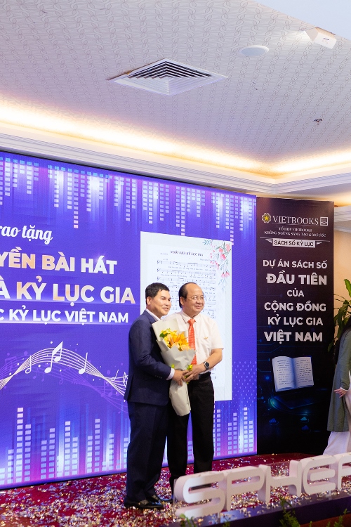 Kỷ lục gia -Nhạc sĩ Thiện Hảo nhận hoa từ Giáo sư Tiến sĩ Hoàng Quang Thuận