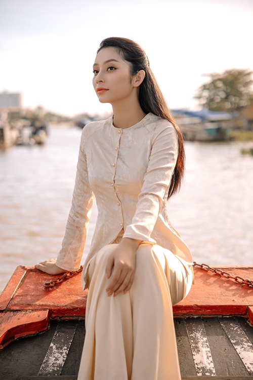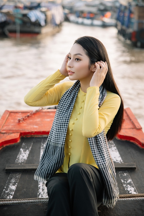 Trong vẻ đẹp của một chợ nổi đặc sắc miền Tây với những thuyền trái cây rực rỡ, bắt mắt, Lâm Thu Hồng trong áo bà ba nổi bật bởi vóc dáng xinh đẹp, thắt đáy lưng ong và nhan sắc rực rỡ mà dịu dàng. Lâm Thu Hồng nói, phụ nữ Việt Nam được sở hữu những trang phục truyền thống vô cùng tuyệt vời. Áo bà ba là một trong số đó. “Diện áo bà ba vào người tôi thấy sao mình dịu dàng quá đỗi, nó khiến tôi đi đứng, giao tiếp cũng bỗng trở nên nhẹ nhàng, dịu dàng hơn rất nhiều. Tôi nghĩ đó là trang phục tuyệt vời không chỉ giúp người phụ nữ khoe được những đường cong của cơ thể mà còn rất mềm mại, nữ tính. Tôi sẽ giới thiệu áo bà ba bên cạnh áo dài ở The Miss Globe”- Lâm Thu Hồng chia sẻ.