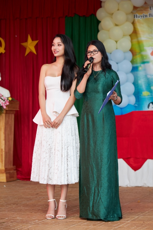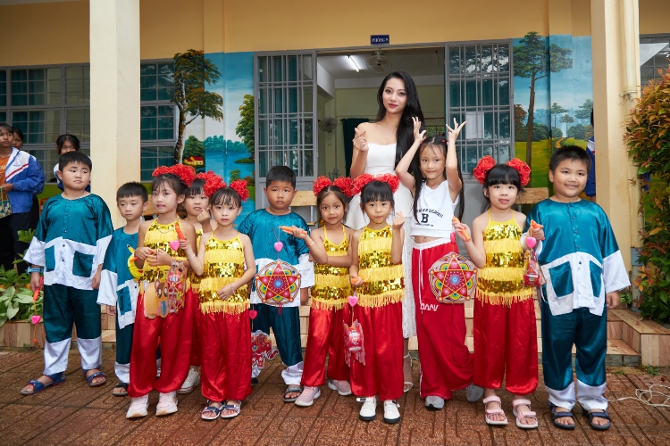 Lâm Thu Hồng mặc váy trắng, xinh như chị Hằng trao quà trung thu cho các em nhỏ ở Lâm Đồng