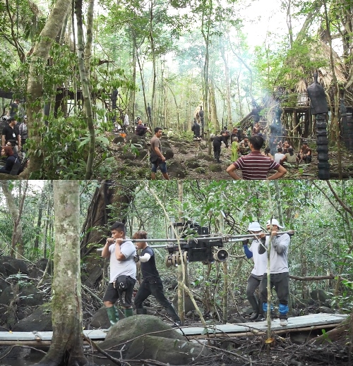 Ekip làm việc tâm huyết, khiêng vác nhiều dụng cụ vào rừng để hoàn thành các phân cảnh liên quan đến ngôi nhà trên cây