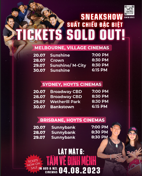 Vừa ấn định lịch chiếu tại Úc và New Zealand, bộ phim “Lật Mặt 6” đã ngay lập tức rơi vào tình trạng “cháy vé” trên tất cả các cụm rạp chỉ sau 1 giờ mở bán, dù tới 20/7 bộ phim mới được công chiếu chính thức tại 2 quốc gia này.