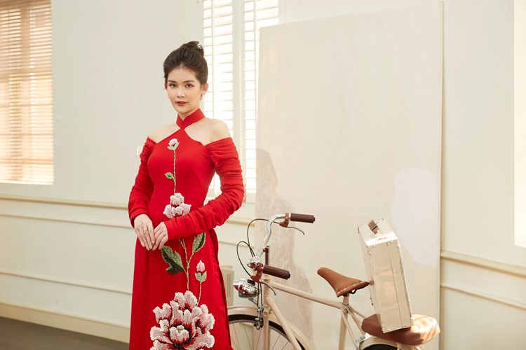Diện loạt thiết kế của Minh Châu, Lê Âu Ngân Anh xoá bỏ định kiến của mọi người về việc người trẻ mặc áo dài. Có thể thấy, để phù hợp với xu hướng của đối tượng trẻ tuổi, nhà mốt khéo léo lồng ghép những hoạ tiết nơ đơn giản, chi tiết voan xuyên thấu ở phần cổ hay tay phồng… mang đến hình ảnh mới mẻ cho người mặc. Bên cạnh những màu sắc nhã nhặn, Minh Châu còn mang đến những thiết kế độc đáo với sắc đỏ quyến rũ, tôn lên nhan sắc mỹ miều của người đẹp Tiền Giang khi cô bước sang tuổi 27.