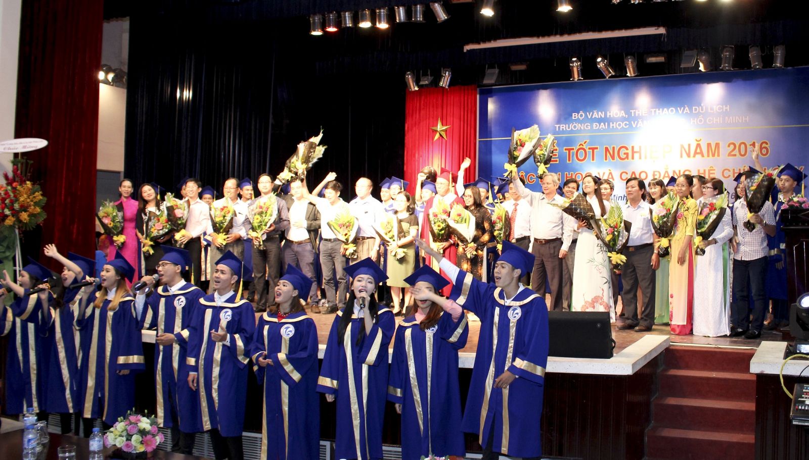 Kết thúc bài cảm tưởng các sinh viên đã lên sân khấu tặng hoa, cuối đầu tri ân các thầy cô và tất cả sinh viên trong hội trường đã đồng loạt đứng lên cùng cất tiếng hát ca khúc “mong ước kỷ niệm xưa” (sáng tác Nguyễn Xuân Phương) và “Điều không bao giờ quên” một sáng tác của Đào Duy Ca cũng là một thầy giáo của trường. Nhiều đôi mắt các sinh viên đã ngấn lệ trong giây phút xúc động và thiêng liêng này. Trong phát biểu dặn dò các tân cử nhân, thạc sĩ Trịnh Đăng Khoa phó trưởng khoa, phụ trách Khoa QLVHNT đã chia sẻ “Tấm bằng này, là sự khẳng định cho bước trưởng thành to lớn của các em về nhận thức, chuyên môn và thái độ đối với nghề nghiệp mà các em đã dày công học tập, rèn luyện trong suốt quãng đời sinh viên vừa qua. Đồng thời, nó còn là kết tinh của tình yêu thương, sự tận tâm, tận tình từ công lao dạy dỗ, nuôi dưỡng của thầy cô, cha mẹ và gia đình để vun vén cho khát vọng thành nhân, thành thân của các em. Sau ngày hôm nay, các em bắt đầu thực hiện con đường lập nghiệp. Thầy mong rằng các em luôn luôn nhớ về Trường...”